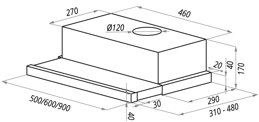 производительность 330 м3/час, 2 скорости, колыбельное управление, алюминиевый фильтр, освещение лампа 2х40 В, уровень шума 52 Дб, мощность мотора 120Вт, диаметр воздуховода D=120мм, вытяжка/воздухоочиститель, выдвижная, встраиваемая модель. В комплекте: переходник с антивозвратным клапаном.