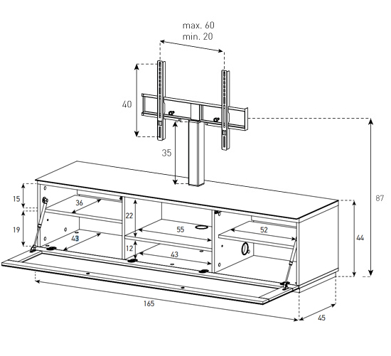 Закрытая стойка под телевизор премиум класса для больших телевизоров. Верхняя полка и дверка сделаны из закаленного стекла. Дверь открывается нажатием. Эффективный кабель-канал для маскировки всех кабелей и шнуров. Скрытые колесики, позволяющие плавно двигать тумбу с техникой, в случае необходимости. Например, протереть пыль за тумбой. Стекло дверки пропускает инфракрасный сигнала (для пультов), то есть оборудование (ДВД плеер, спутниковый ресивер и пр.) внутри стойки будет работать с пульта при закрытой дверке. ТВ стойка оснащена универсальным поворотным кронштейном с возможностью регулировки телевизора по высоте.